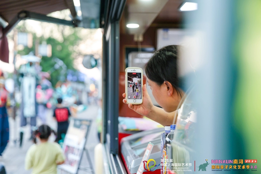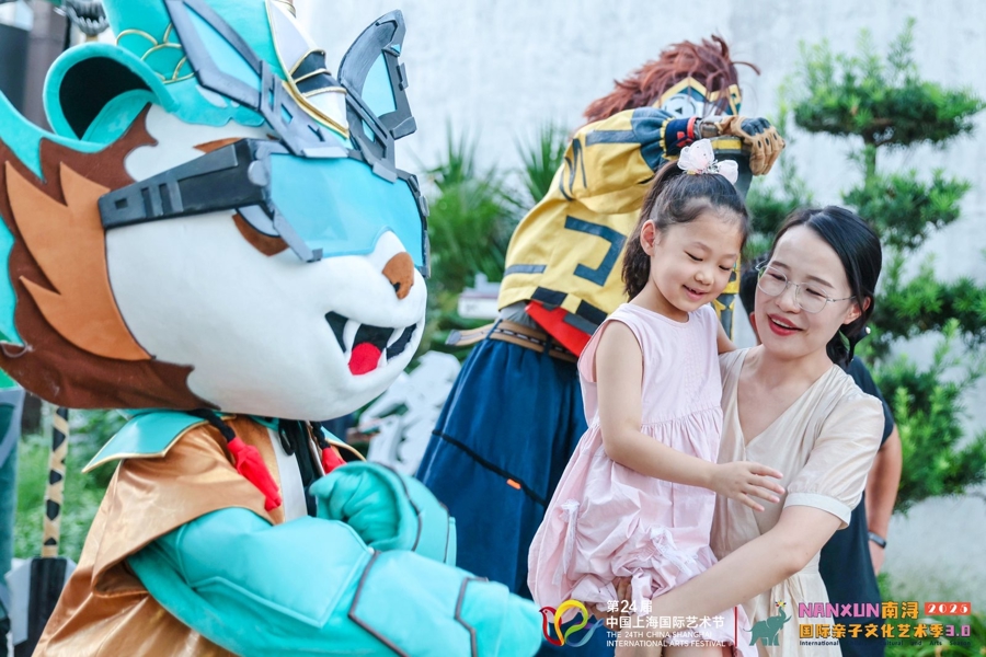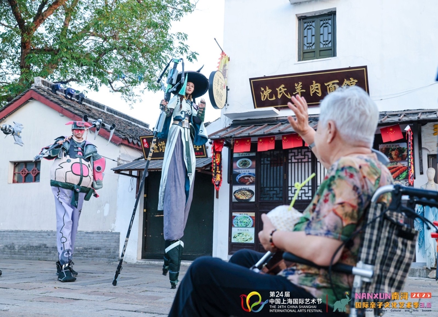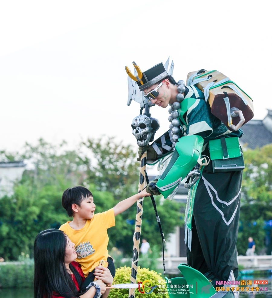 白墙黛瓦作布景,嬉戏三宝款款而来,象宝摇头晃脑引得路人纷纷举起手机;从“机械之都”踏入小桥流水的古镇,“蝉”在烟火人间开启新一轮“西行”之路,有E人小姐姐拉着他转圈圈。10月11日,2025南浔国际亲子文化艺术季3.0启幕,这场落地第24届中国上海国际艺术节浙江南浔分会场的活动,把艺术搬进古镇街巷、运河草坪,让亲子家庭与游客沉浸式感受“生活即艺术”的魅力。