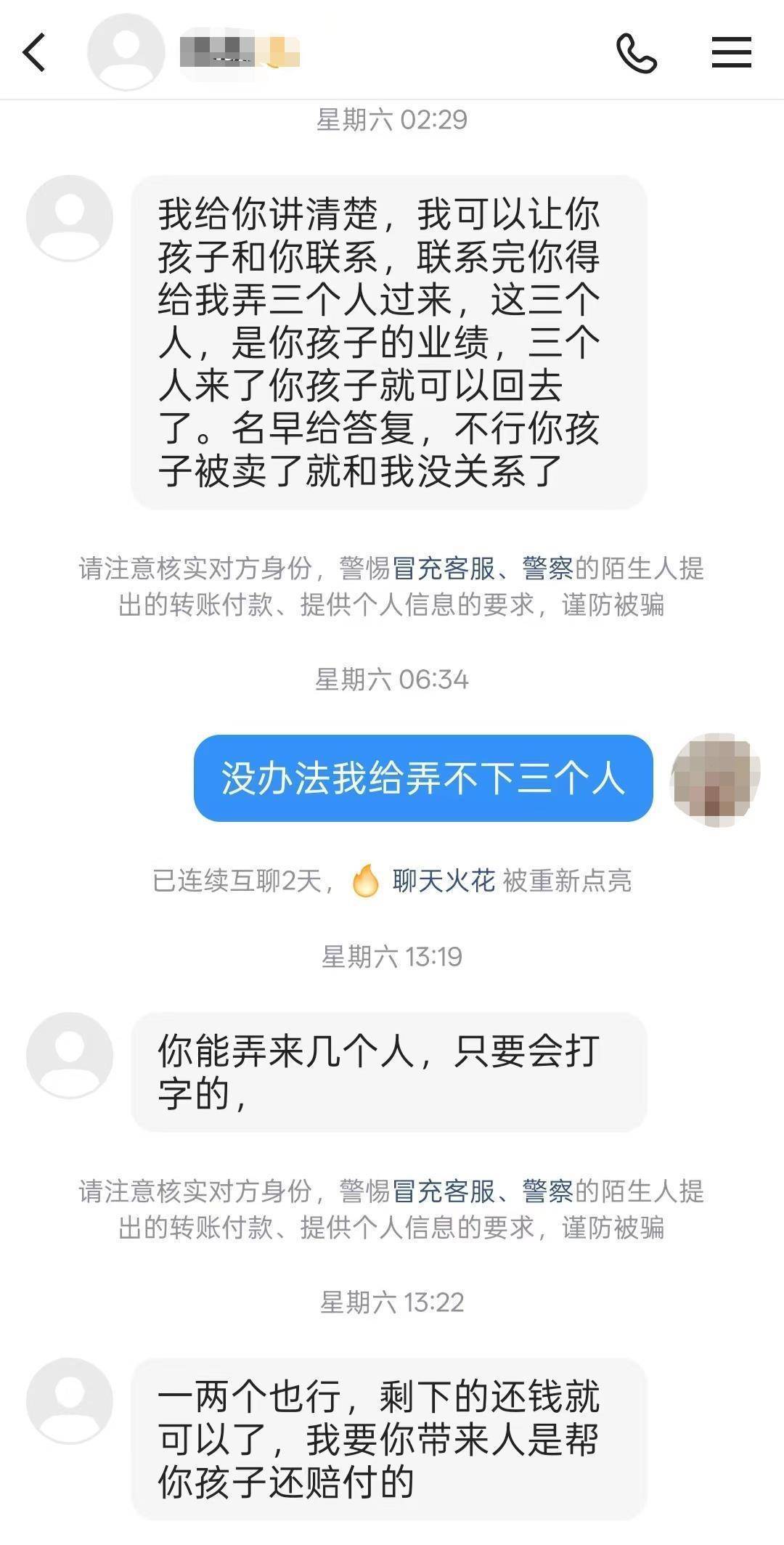 郭先生告诉极目新闻记者,11月3日,他儿子的那个短视频账号突然回复了他,但对方并不是他的儿子,而是一名疑似在园区的人,对方称郭先生如果想要联系上他的儿子,就要再骗过去3个人,“联系完你得给我弄三个人过来,这三个人是你孩子的业绩,三个人来了你孩子就可以回去了”,还说明天准备把他的儿子卖到缅甸,对此郭先生表示他做不到,对方回复说:“我们这缺人,不缺钱”“人都弄不来,你准备好赔付20万,准备好了你和你孩子通话”。郭先生说,他家里老人刚做完手术,实在筹不到这么多钱,对方又表示,实在缺钱可以卖人,一个人给5万元。