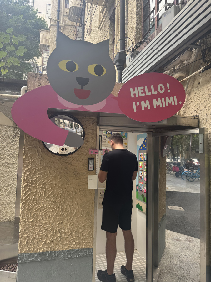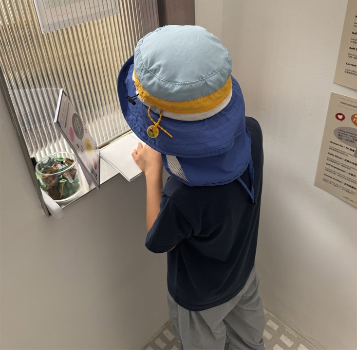 观众首先需要在门口自助扫码,才能解锁展厅“大门”,身高超过1.8的观众需要躬身入内,展厅划分为三个单元——左面、正面和右面,参观的观众只需自转,不需要迈步。欢快旋律迎接着每一位开门者,艺术家用中英文双语自我介绍——欢迎来到喵喵宇宙是一个由热爱驱动、温柔而诗意的世界。展厅的透光天顶,让洒入的光照点亮了展墙,迷你展厅里安装了空调,这几天秋日里让参观者舒爽。