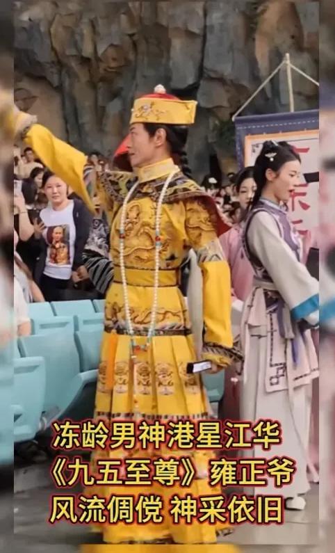 62 岁的他裹着明黄色龙袍站在石台上,眼神里还带着当年戏里的锐利劲儿,气场半点没减。