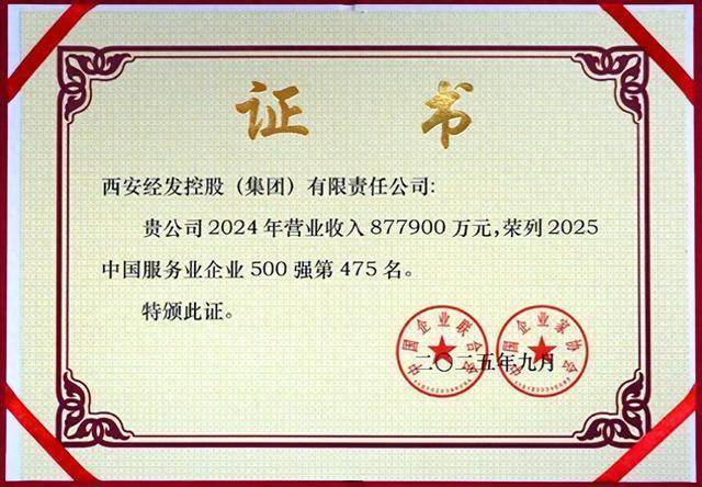 近日,中国企业联合会、中国企业家协会发布“2025中国服务业企业500强”榜单,西安经发控股(集团)有限责任公司(以下简称“经发控股”)凭借稳健的综合实力与卓越的服务业绩再次入选,持续彰显其在服务业领域的领先地位与品牌影响力。