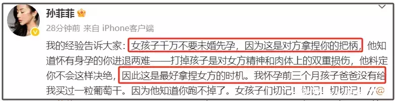 孙菲菲还总结自己的经验劝告女孩不要未婚先孕,称这是对方拿捏你的把柄和时机,会从心理和感情方面知道女方有身孕进退两难,继而拿捏。她还称自己怀孕三个月的时候孩子爸爸连葡萄干都没有买过,原因是他知道你跑不掉了。从这也能看出,孙菲菲这段婚姻的开始,男方就没有付出,也难怪婚后一毛不拔。