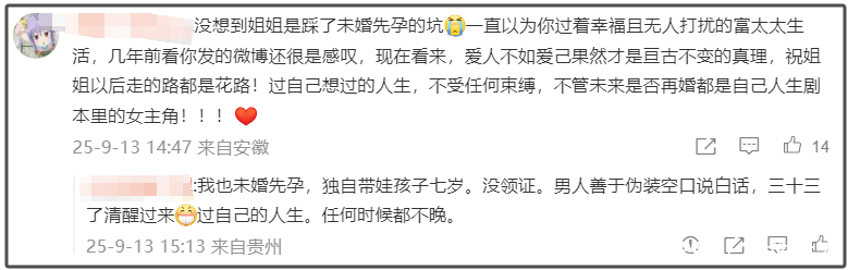 看到孙菲菲自曝未婚先孕,不少网友恍然大悟她踩坑了,称原本以为她过着无忧的富太生活才退圈,原来都是表面幸福。不过,如今不被婚姻束缚做自己人生的主角也不晚,还有同样经历的网友在评论区给她鼓励。