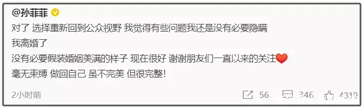 孙菲菲当年的婚礼举办的很盛大,坊间都传其嫁了豪门,婚后选择相夫教子淡圈。而从孙菲菲的字里行间来看,丈夫并不是豪门,选择离婚也是梦醒了。再结合丈夫高管的职务来看,纯粹是被一些高大上的名头滤镜蒙骗了。