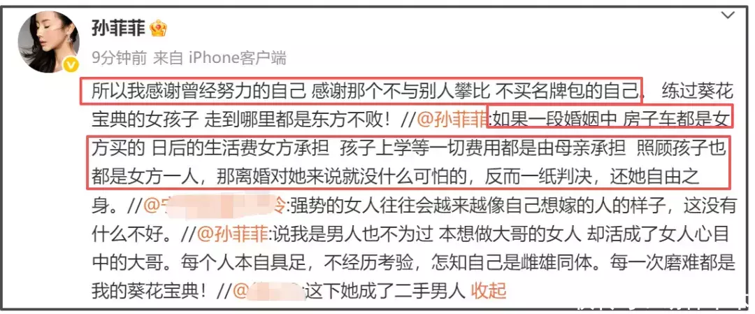 她表示婚后房子、车都是自己购买,生活费、孩子学费等一切杂费也是她支付,甚至照顾孩子都是女人自己,一纸判决的离婚终结了这种日子,给了她自由身。同时,她也感谢曾经努力却不攀比的自己,以及不爱名牌包的自己,句句都在内涵丈夫在婚姻中的失职。